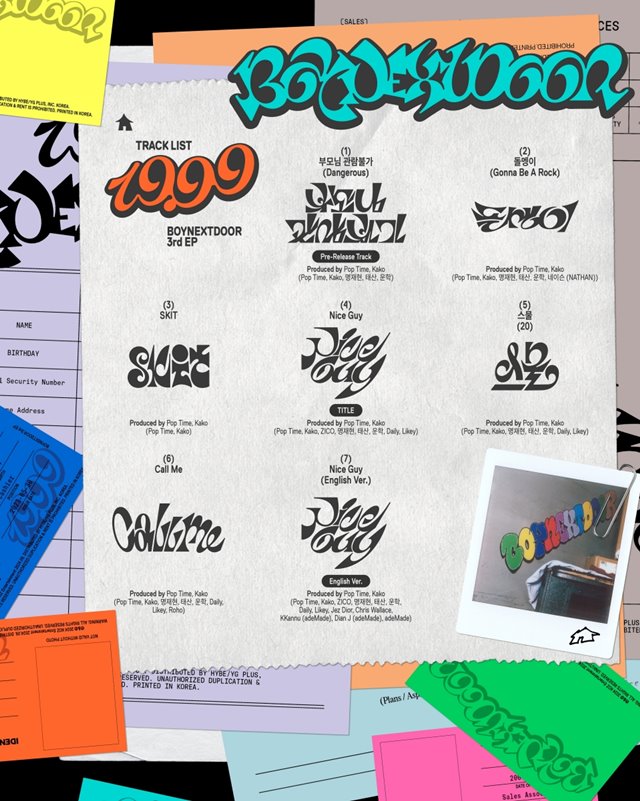 보이넥스트도어(성호, 리우, 명재현, 태산, 이한, 운학)는 19일 오후 10시 팀 공식 SNS에 미니 3집 ‘19.99’의 트랙리스트를 게재했다. 메모장을 뜯은 듯한 트랙리스트 이미지에는 신보에 수록된 곡명이 키치한 서체로 적혀 있다.