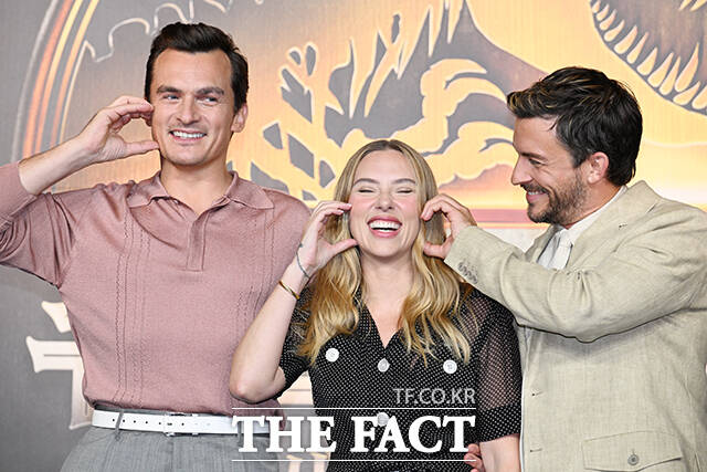 [더팩트ㅣ박헌우 기자] 배우 루퍼트 프렌드와 스칼렛 요한슨, 조나단 베일리(왼쪽부터)가 1일 오후 서울 종로구 포시즌스 호텔 서울에서 열린 영화 '쥬라기 월드: 새로운 시작' 기자간담회에 참석해 포즈를 취하고 있다.