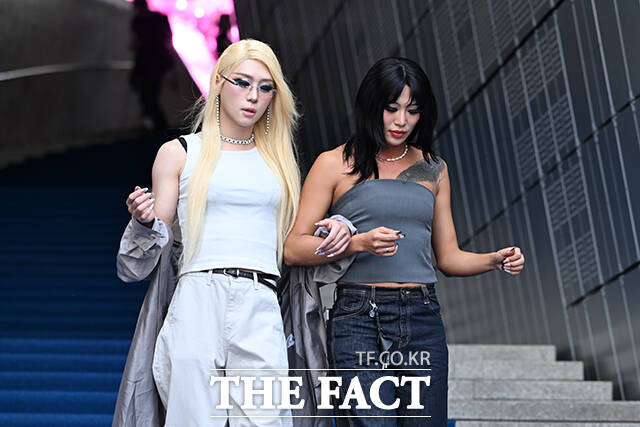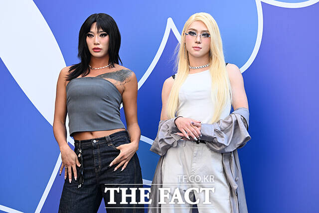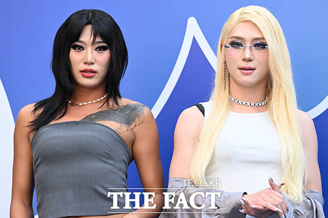 드랙아티스트 보리(왼쪽)와 지반이 5일 오후 서울 중구 동대문디자인플라자(DDP)에서 열린 2026 S/S 서울패션위크 리이 포토월에 참석해 포즈를 취하고 있다. /서예원 기자