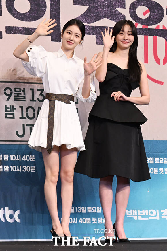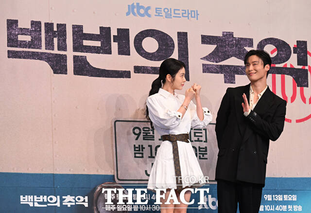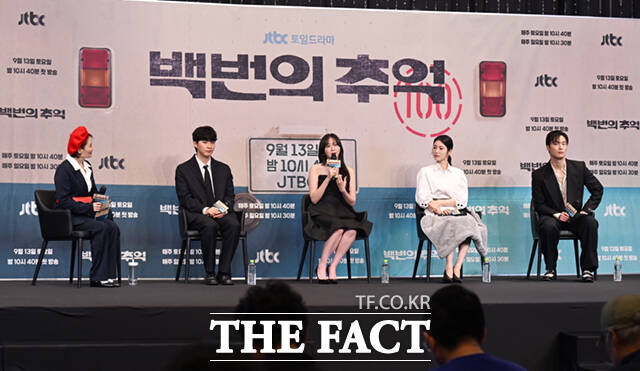 [더팩트ㅣ이새롬 기자] 김상호 감독과 배우 신예은, 김다미, 허남준(왼쪽부터)이 11일 서울 구로구 더 링크 서울 호텔에서 열린 JTBC 새 토일드라마 '백번의 추억' 제작발표회에 참석해 포즈를 취하고 있다.