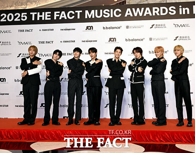 <더팩트>가 주최하고 팬앤스타와 더스퀘어이엔엠이 주관하는 '2025 더팩트 뮤직 어워즈(THE FACT MUSIC AWARDS, TMA)'가 20일 오후 '마카오 아웃도어 퍼포먼스 베뉴'에서 열린 가운데 그룹 아홉(AHOF)의 장슈아이보와 박한, 서정우, 제이엘, 스티븐, 차웅기, 박주원, 다이스케(왼쪽부터)가 레드카펫을 밟고 있다. /이효균 기자