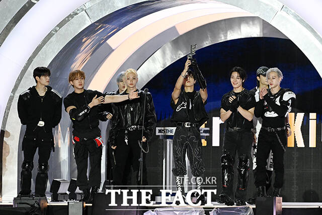 [더팩트ㅣ마카오=서예원 기자] <더팩트>가 주최하고 팬앤스타와 더스퀘어이엔엠이 주관하는 '2025 더팩트 뮤직 어워즈(THE FACT MUSIC AWARDS, TMA)'가 20일 오후 '마카오 아웃도어 퍼포먼스 베뉴'에서 열린 가운데 그룹 스트레이 키즈가 '올해의 아티스트'를 수상하고 있다.