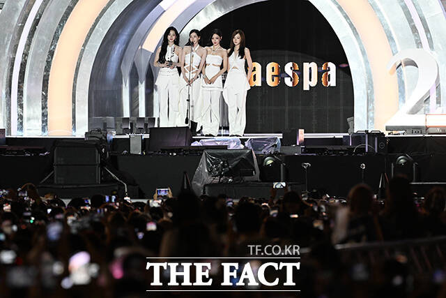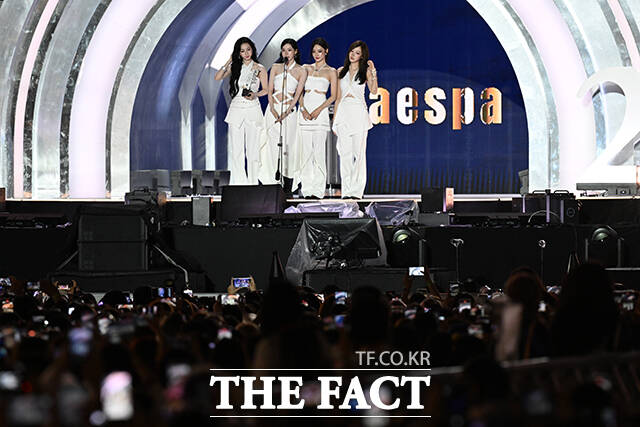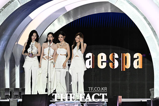 <더팩트>가 주최하고 팬앤스타와 더스퀘어이엔엠이 주관하는 '2025 더팩트 뮤직 어워즈(THE FACT MUSIC AWARDS, TMA)'가 20일 오후 '마카오 아웃도어 퍼포먼스 베뉴'에서 열린 가운데 그룹 에스파가 '올해의 아티스트'를 수상하고 있다. /마카오=서예원 기자