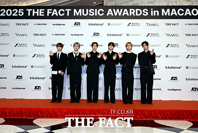 <더팩트>가 주최하고 팬앤스타와 더스퀘어이엔엠이 주관하는 '2025 더팩트 뮤직 어워즈(THE FACT MUSIC AWARDS, TMA)'가 20일 오후 '마카오 아웃도어 퍼포먼스 베뉴'에서 열린 가운데 그룹 투어스(TWS)의 한진과 지훈, 영재, 신유, 경민, 도훈(왼쪽부터)이 레드카펫을 밟고 있다. /이효균 기자