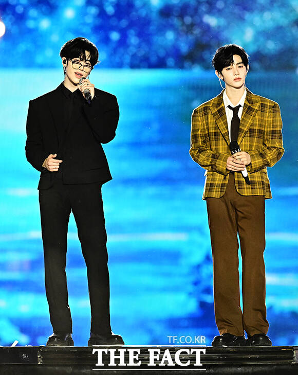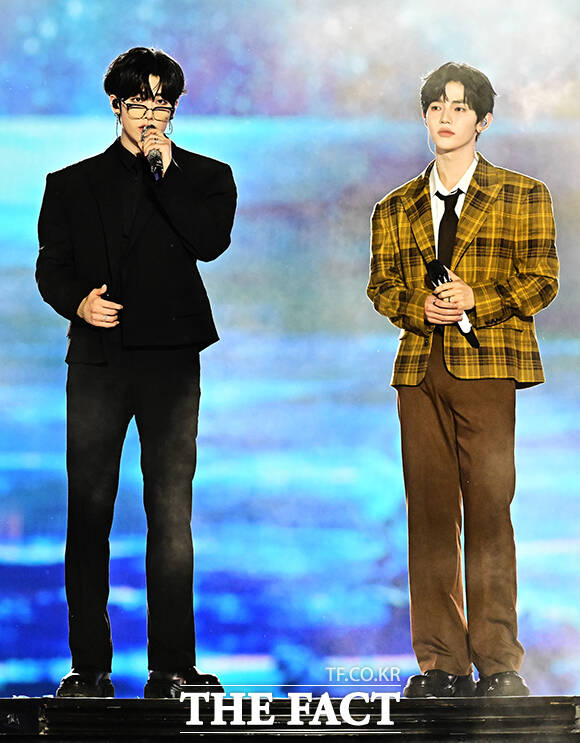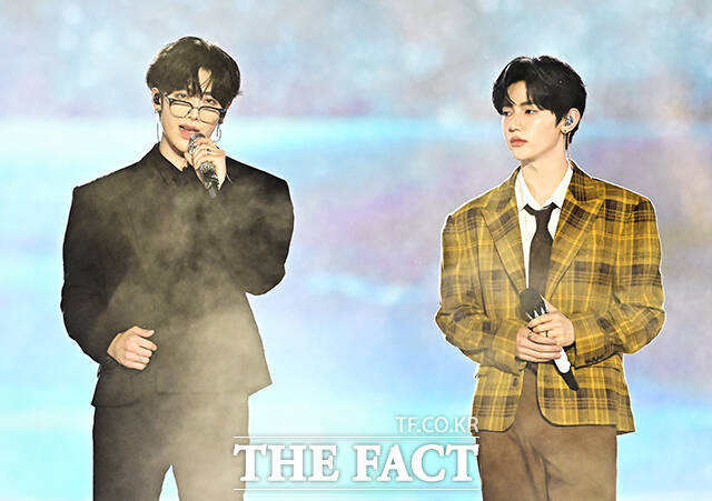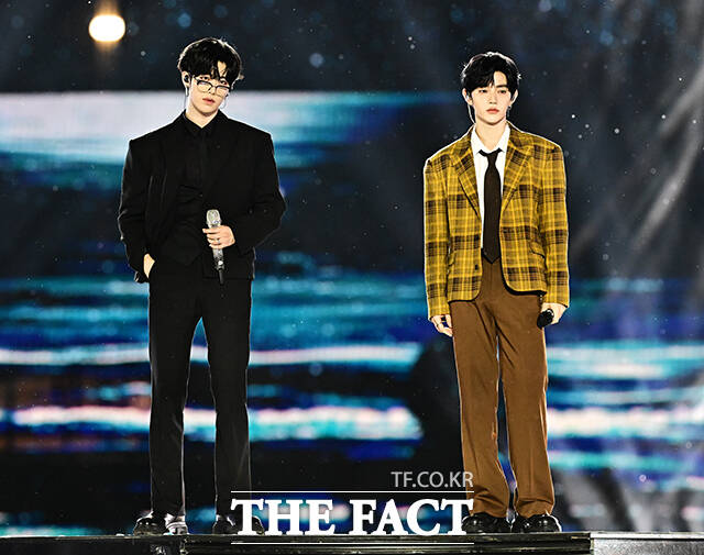 [더팩트ㅣ마카오=배정한 기자] <더팩트>가 주최하고 팬앤스타와 더스퀘어이엔엠이 주관하는 '2025 더팩트 뮤직 어워즈(THE FACT MUSIC AWARDS, TMA)'가 20일 오후 '마카오 아웃도어 퍼포먼스 베뉴'에서 열린 가운데 그룹 제로 베이스원 리키(왼쪽)와 장하오가 화려한 무대를 펼치고 있다.