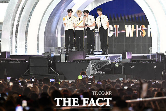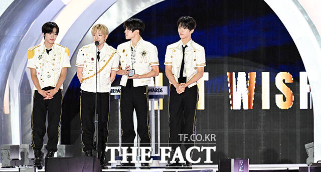 <더팩트>가 주최하고 팬앤스타와 더스퀘어이엔엠이 주관하는 '2025 더팩트 뮤직 어워즈(THE FACT MUSIC AWARDS, TMA)'가 20일 오후 '마카오 아웃도어 퍼포먼스 베뉴'에서 열린 가운데 그룹 엔시티 위시(NCT WISH)가 '올해의 아티스트'를 수상하고 있다. /마카오=서예원 기자