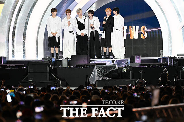 [더팩트ㅣ마카오=서예원 기자] <더팩트>가 주최하고 팬앤스타와 더스퀘어이엔엠이 주관하는 '2025 더팩트 뮤직 어워즈(THE FACT MUSIC AWARDS, TMA)'가 20일 오후 '마카오 아웃도어 퍼포먼스 베뉴'에서 열린 가운데 그룹 투어스(TWS)가 '올해의 아티스트'를 수상하고 있다.