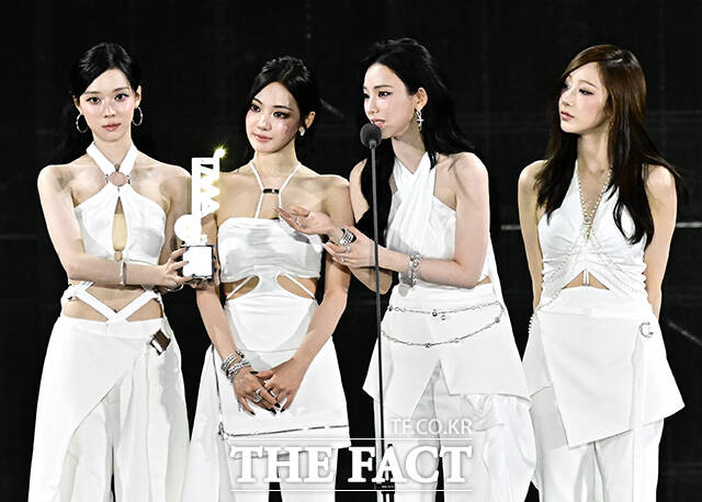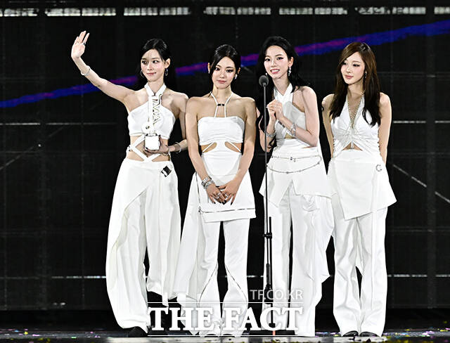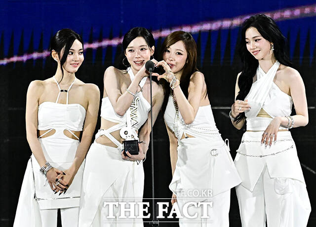 [더팩트ㅣ마카오=배정한 기자] <더팩트>가 주최하고 팬앤스타와 더스퀘어이엔엠이 주관하는 '2025 더팩트 뮤직 어워즈(THE FACT MUSIC AWARDS, TMA)'가 20일 오후 '마카오 아웃도어 퍼포먼스 베뉴'에서 열린 가운데 그룹 에스파가 뮤즈 오프 더 이어를 수상한 뒤 소감을 밝히고 있다.