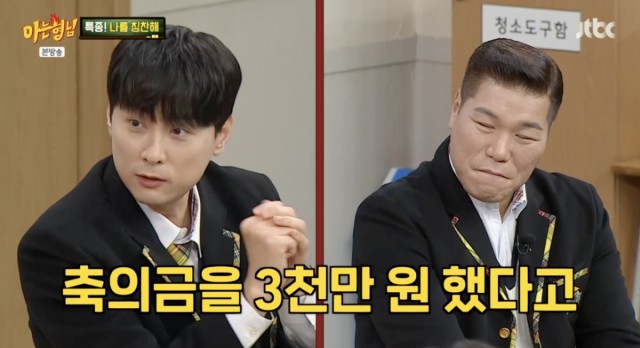 민경훈은 방송에서 "루머가 계속 돌고 있다. 바로잡을 필요가 있다"며 "내가 결혼했을 때 장훈이가 축의금을 3천만 원 냈다는 소문이 SNS로 돌고 있다"고 말했다. 이어 그는 "솔직히 장훈이 사이즈 알잖나. 3천이었을까, 3억이었을까?"라고 농담을 던져 현장을 웃음바다로 만들었다.