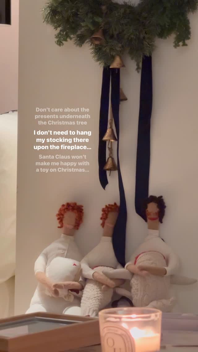 사진 속에는 크리스마스 장식으로 꾸며진 벽면을 배경으로 흰색 드레스를 입은 인형들이 서로를 바라보고 서 있다. 빨간 머리와 갈색 머리 인형, 그리고 양초 등이 따뜻한 연말 분위기를 자아내고 있다.