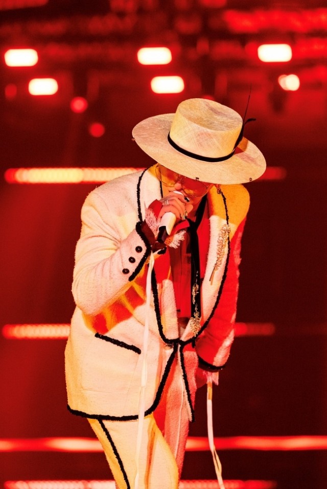 지드래곤은 이번 공연에서 샤넬의 하이 주얼리 '플륌 드 샤넬(Plume de CHANEL)' 브로치를 착용했다. 이 브로치는 깃털 모티프가 돋보이는 디자인으로, 지드래곤의 예술적 감성과 무대 존재감을 강조하는 역할을 했다. 의상은 샤넬의 커스텀 룩으로 구성되었으며, 블랙 크리스탈 자수 브레이드 장식이 더해진 오프 화이트 컬러의 울 팬츠 수트와 크림슨 컬러의 실크 크레이프 셔츠를 매치하여 독창적인 스타일을 선보였다.