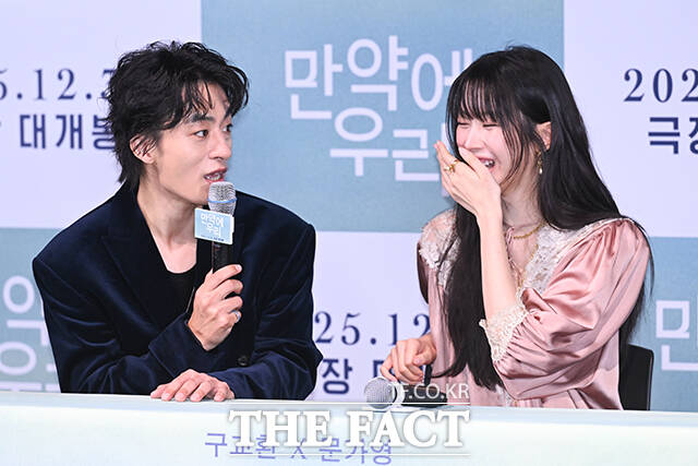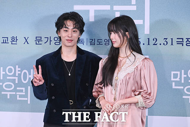 배우 구교환(왼쪽)과 문가영이 18일 오후 서울 용산구 CGV 용산 아이파크몰에서 열린 영화 ‘만약에 우리’ 언론 시사회 및 기자간담회에 참석해 포즈를 취하고 있다. /서예원 기자