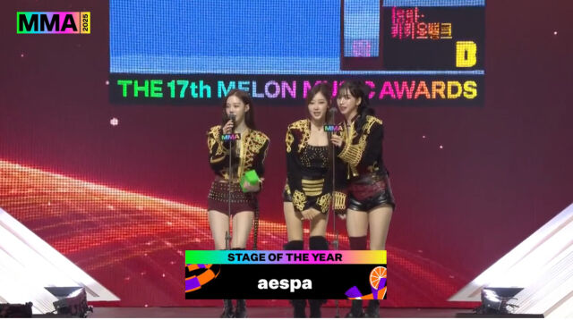 MMA2025는 2024년 10월 31일부터 2025년 11월 19일까지 발매된 모든 음원을 대상으로 하며, 이날 시상식에서는 모델 겸 방송인 주우재와 유튜버 곽튜브가 시상자로 나섰다. 에스파는 '스테이지 오브 더 이어' 수상자로 호명됐다. 그러나 멤버 닝닝은 감기 증상으로 인해 일부 행사에 불참하였고, 무대에는 카리나, 윈터, 지젤만이 올랐다.