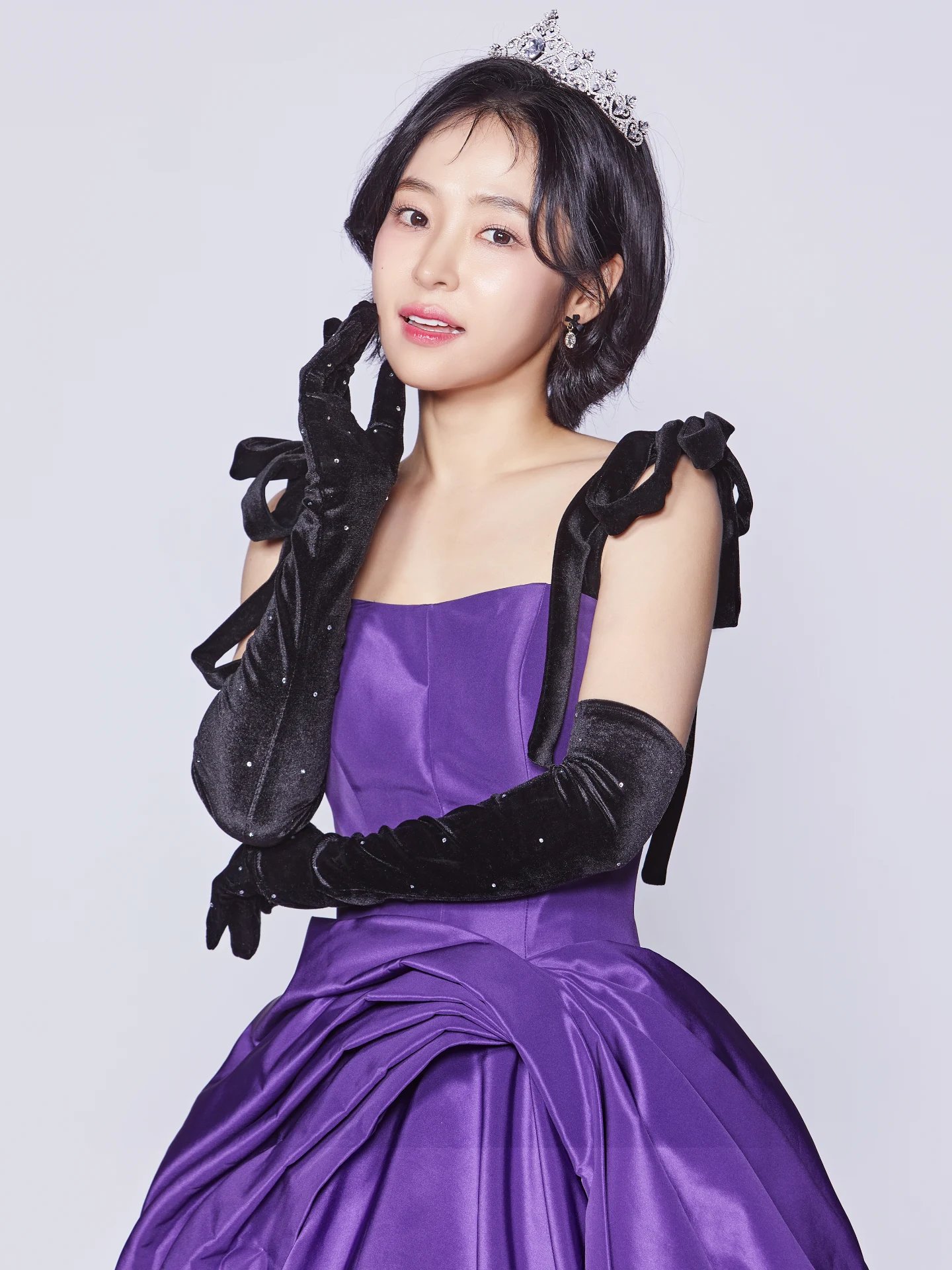 최근 공개된 화보에서는 보라색 드레스와 긴 검은 장갑을 착용하고 한 손으로 턱을 괴며 미소를 짓는 우아한 모습이 눈길을 끌었다. 왕관을 쓴 채 단색 흰 배경 앞에서 촬영한 모습은 고혹적이면서도 세련된 분위기를 자아냈다.