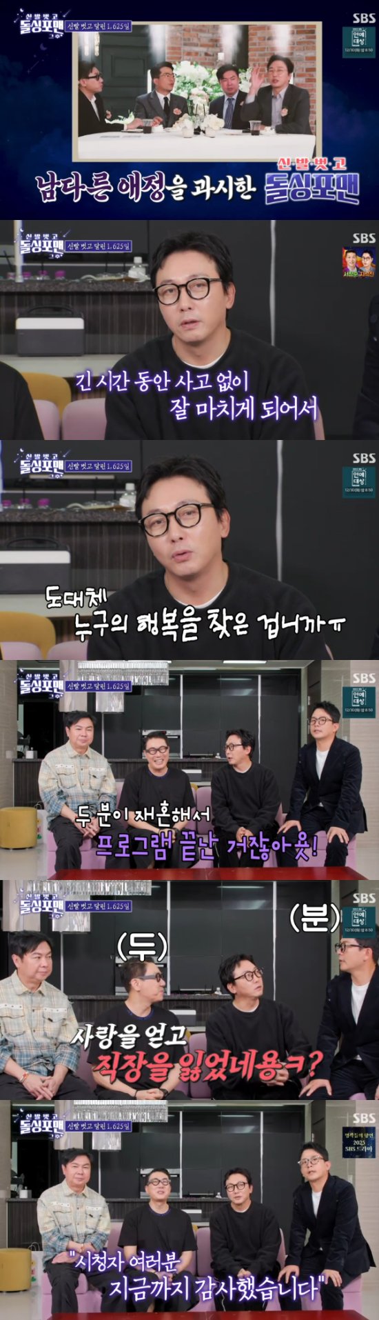 방송 말미에 멤버들은 '돌싱포맨' 종영에 대한 소감을 전했다. 탁재훈은 "긴 시간 동안 별다른 사고 없이 잘 마치게 되어서 기쁘다. 그동안 행복하고 감사했다"며 소회를 밝혔다. 그는 이어서 "두 분 때문에 프로그램이 끝나는 거 아니냐. 두 분은 사랑을 얻고 직장을 잃었네요?"라고 이상민과 김준현을 원망하는 발언을 했다. 탁재훈은 "그래도 돌싱들은 계속 생겨날 것"이라며 긍정적인 마무리를 지었다. 마지막으로 멤버들은 시청자들에게 감사의 인사를 전하며 방송을 마쳤다.