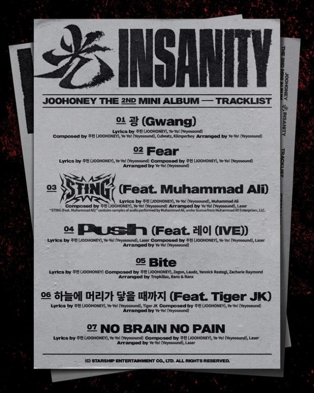 공개된 트랙리스트에 따르면, 신보 '光 (INSANITY)'에는 총 7곡이 수록된다. 선공개곡 'Push (Feat. 레이 of IVE)'와 타이틀곡 'STING (Feat. Muhammad Ali)'을 포함하여 '광 (Gwang)', 'Fear', 'Bite', '하늘에 머리가 닿을 때까지 (Feat. Tiger JK)', 'NO BRAIN NO PAIN'이 포함된다. 특히, 타이틀곡 'STING'은 전설적인 복싱 선수 무하마드 알리가 피처링으로 참여해 관심을 끌고 있다.