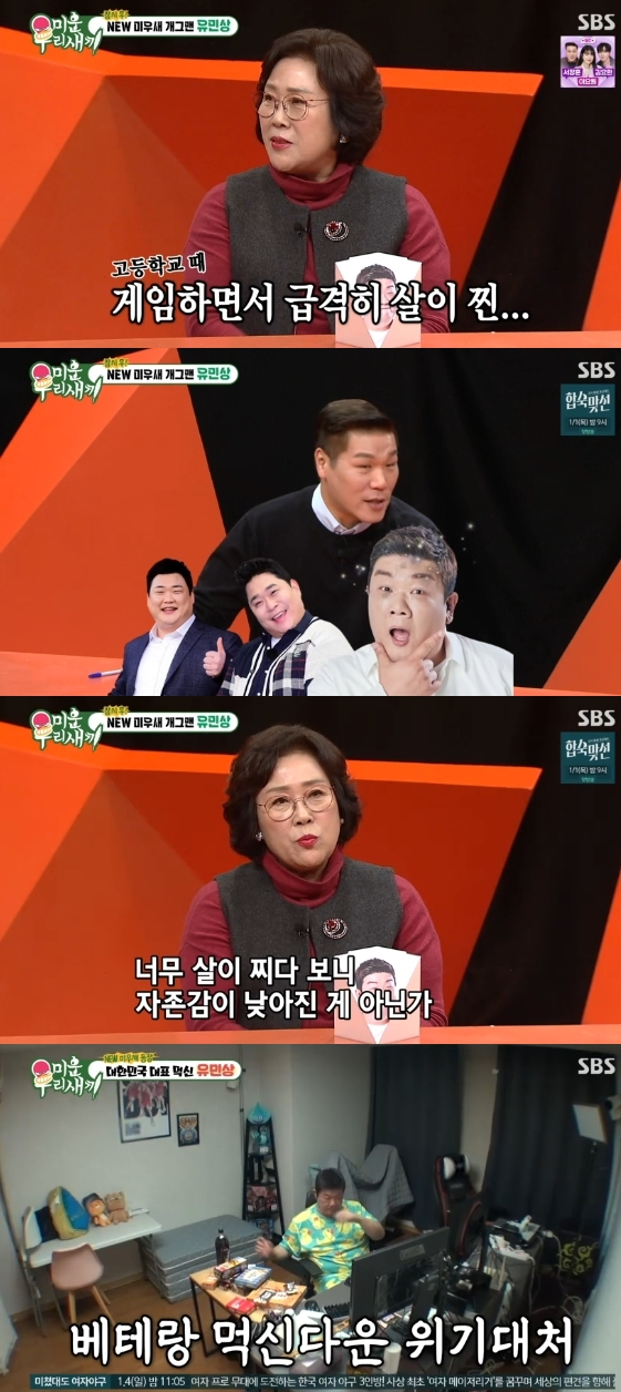 유민상은 고등학교 시절부터 비만으로 고생해왔다. 어머니는 "아들이 게임을 하면서 급격하게 살이 쪘다"며 아들의 생활 패턴에 대한 우려를 표명했다. 이날 방송에서 유민상의 친구들 중 다수는 결혼해 자녀를 둔 상황임에도 불구하고, 유민상은 여전히 결혼하지 않은 상태다. 서장훈이 "왜 우리 아들만 아직 결혼을 못 했나 싶지 않냐"고 묻자, 유민상 어머니는 "갑자기 살이 쪄서 자존감이 낮아진 게 아닌가 싶다. 내 친구들은 거의 손주를 봤는데, 내 아들만 못 간 것 같아서 너무 속상하다"고 말했다.