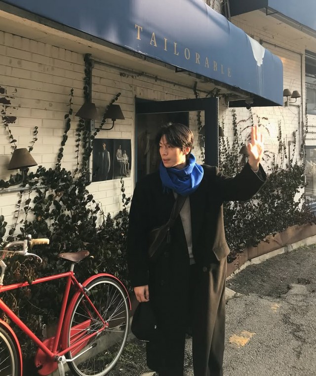 특히 파란색 스카프가 포인트인 그의 차분한 스타일링이 눈길을 끌며, 정면을 응시한 침착한 표정에서는 묵직한 내면의 단단함이 느껴진다. 자전거와 함께 한 사진에서는 한 손을 들어 인사하는 듯한 모습도 포착돼 친근한 매력을 더한다.