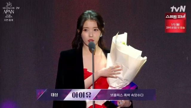 아이유는 넷플릭스 오리지널 시리즈 '폭싹 속았수다'에서 오애순과 그의 딸 양금명 역할을 맡아 뛰어난 연기를 선보였다. 그녀는 수상 소감에서 "'폭싹 속았수다'는 저에게 있어 참여했다는 것만으로도 훈장처럼 남을 자랑스럽고 소중한 작품"이라고 밝혔다. 이어 "주어진 하루를 성실하게 살아가는 사람들의 이야기"라며 "그들의 삶에 응원과 이해, 공감을 보내준 모든 시청자들의 삶에 황홀한 보상이 기다리고 있길 바란다"고 덧붙였다.