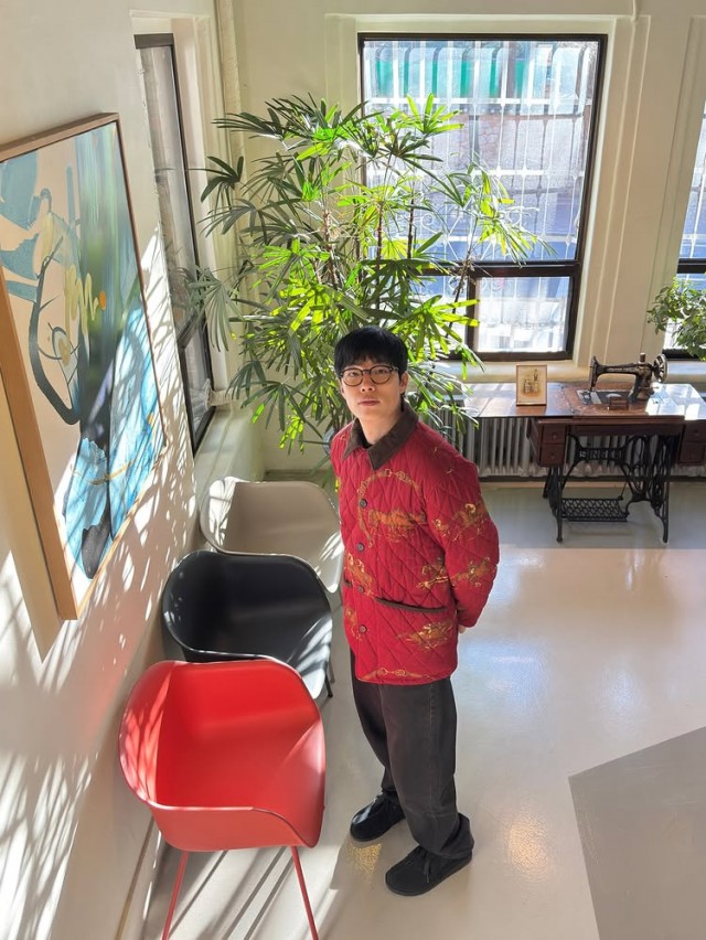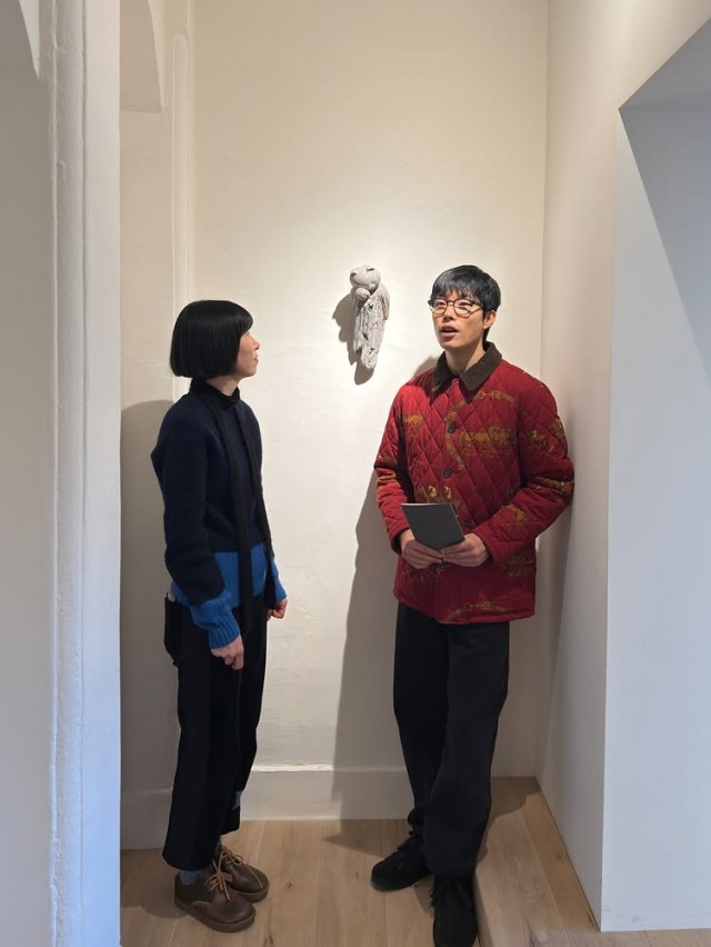 함께 공개된 사진들에는 흰색 벽면과 나무 조각들이 놓인 공간, 정갈하게 진열된 선반 위의 조각들, 그리고 빨간색 외투를 입은 류준열이 선반을 바라보거나 창가에서 책을 들고 있는 모습이 담겨 있다. 인위적인 연출 없이 자연스러운 분위기 속에서 예술적인 감성이 묻어난다. 특히 안경을 쓴 모습이 인상적이며, 고요하고 차분한 분위기를 전한다.