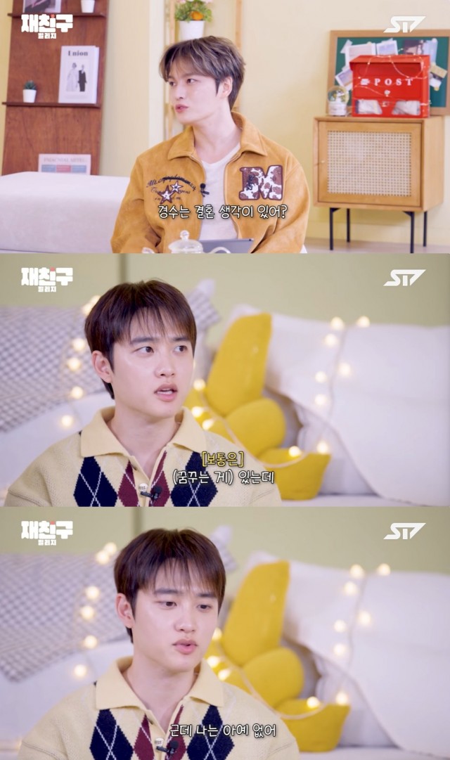 엑소의 도경수(디오)가 결혼에 대한 질문에 답변했다. 30일 유튜브 채널 '재친구'에서 '모두 출신이 같다 (노래짱 외모짱 그냥짱)'라는 제목의 영상이 공개됐다. 이 영상에서는 도경수와 나윤권이 게스트로 출연해 김재중과 대화를 나누었다.