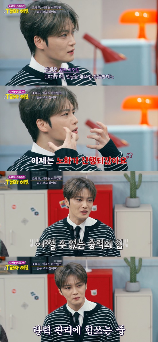 가수 김재중이 노화에 대한 솔직한 생각을 밝혔다. JTBC 예능 프로그램 '이과생 상담동아리-T끌모아 해결'에 출연한 김재중과 조째즈는 노화 관리에 대한 이야기를 나눴다. 조째즈는 "이제는 목소리가 아닌 얼굴로 승부를 보고 싶다"며 비주얼 관리에 대한 고민을 털어놓았다. 그는 "2000년대생들과 같이 활동하다 보니 소속사 사장님 같은 기분이다. 노화 관리도 하고 잘생겨 보이고 싶다"고 말했다.