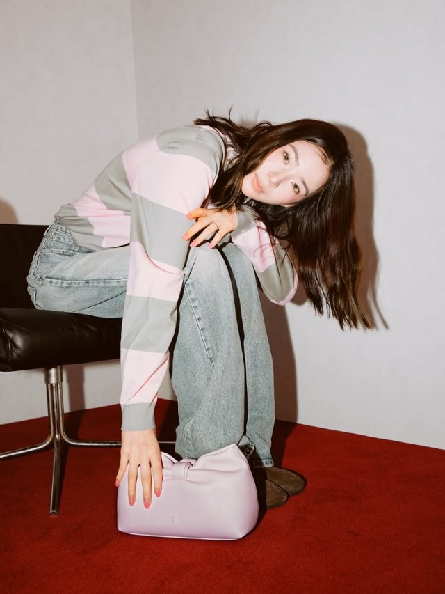 사진 속 아이린은 회색과 분홍색 스트라이프 스웨터와 청바지를 매치한 편안한 룩을 착용하고, 단색 벽과 빨간 카펫이 깔린 공간에서 가방을 한 손으로 들거나 소파에 앉아 포즈를 취하고 있다. 정면을 응시하며 입을 다문 채 또는 미소를 띤 표정으로 우아하고 세련된 분위기를 연출했다. 특히, 가방과 자연스럽게 어우러진 차분한 스타일이 디올의 감성을 고스란히 전달한다.