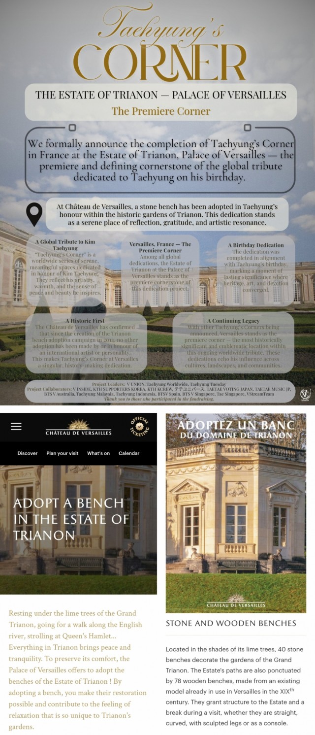 뷔의 이름은 유럽의 대표 랜드마크이자 유네스코 세계 문화유산인 베르사유 궁전 정원에 영구히 보존된다. 팬들은 뷔의 생일을 기념하는 이 벤치가 많은 이들에게 기억될 것이라고 밝혔다.