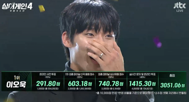이오욱이 '싱어게인4'에서 우승을 차지했다. 6일 방송된 JTBC 예능 프로그램 '싱어게인4'의 최종 파이널 무대에서 이오욱은 톱4인 슬로울리, 김재민, 도라도와 경쟁을 벌였다. 최종 순위는 실시간 문자 투표, 온라인 투표, 신곡 음원, 심사위원 점수를 종합하여 결정됐다. 이오욱은 1위로 호명되었고, 그는 "두 번 다시 안 울어야지라고 다짐했는데 오늘은 기쁜 날이니까 감사히 울도록 하겠다. 저는 도전한 것밖에 없다. 여기서 다 만들어준 것이다. 좋은 결과가 있는 게 너무 감사할 따름"이라고 소감을 밝혔다. 2위는 도라도, 3위는 김재민, 4위는 슬로울리가 차지했다.