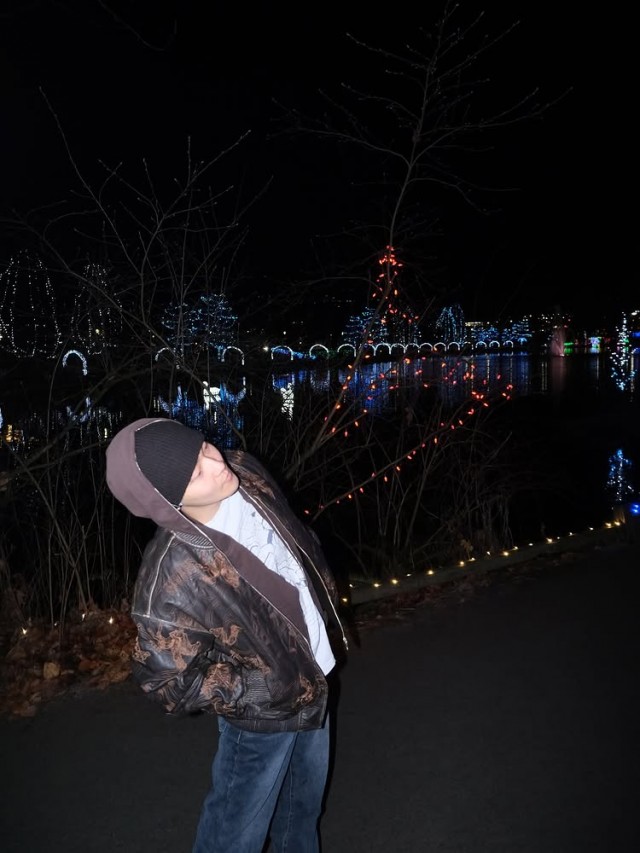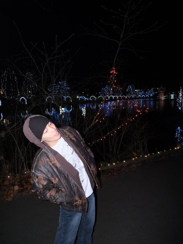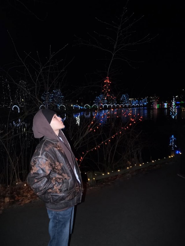 케빈은 회색 후드에 카모플라주 재킷과 청바지를 매치한 캐주얼한 차림으로, 밤하늘을 올려다보거나 몸을 약간 기울인 채 고개를 돌리는 모습이 담긴 여러 장의 사진을 게재했다. 사진 배경에는 조명이 켜진 나무와 호수, 다양한 색상의 조명 장식이 어우러져 몽환적이고 차분한 분위기를 자아낸다.
