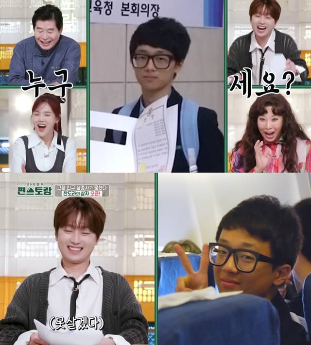“학생 주임 선생님 아니야?”... 친구들의 거침없는 폭로 이날 방송에서 이찬원의 친구들은 그가 고등학생 시절 찍은 사진들을 대거 공개했다. 사진 속 이찬원은 지금의 세련된 모습과는 거리가 먼, 얼굴의 절반을 가리는 두꺼운 안경을 쓴 풋풋한 모습이었다. 특히 고등학생임에도 불구하고 정장을 즐겨 입었던 그의 독특한 패션 감각이 화제가 되었다. 친구들은 야구장에 정장을 입고 나타난 이찬원의 사진을 보며 “무슨 고등학생이 학생 주임 선생님 같다”라고 거침없이 농담을 던졌다.