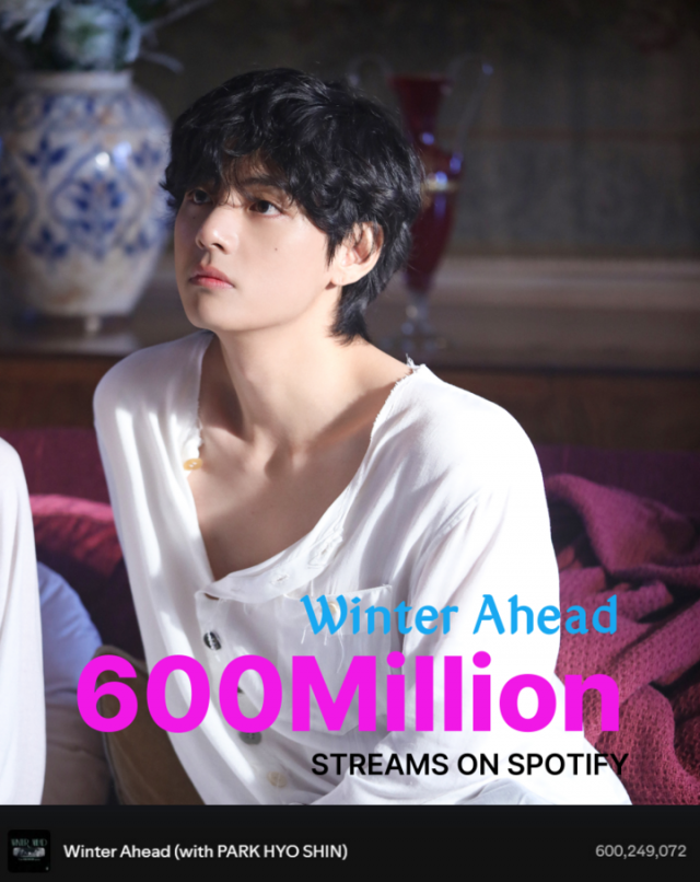 방탄소년단(BTS) 뷔의 '윈터 어헤드'가 스포티파이에서 6억 스트리밍을 돌파했다. 이 곡은 뷔가 박효신과 협업한 작품으로, 2024년 11월 29일에 발매되었다. '윈터 어헤드'는 발매 이후 367일 동안 스포티파이 글로벌 차트에 차트인 기록을 유지하고 있다.