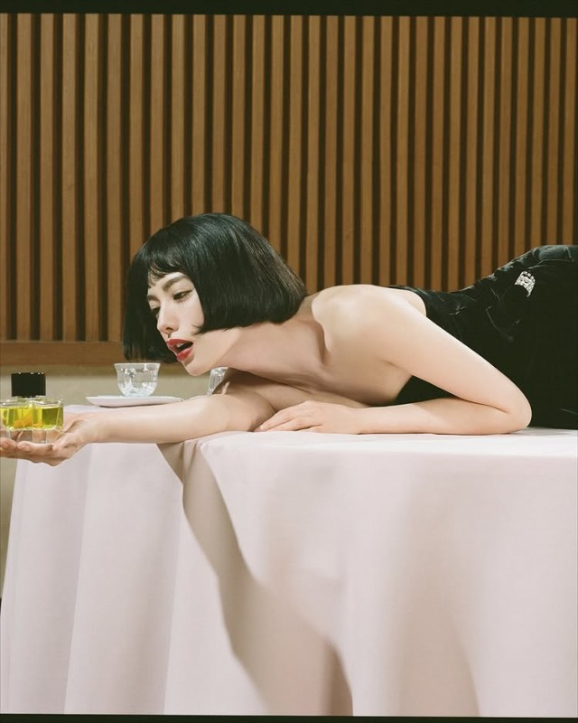 또 다른 사진에서는 핑크색 테이블보가 덮인 원형 테이블 위에 무릎을 꿇고 앉아 향수와 와인잔을 옆에 둔 채 고개를 위로 젖히며 몽환적인 분위기를 연출하기도 했다. 일부 사진에서는 탁자 위에 누워 포즈를 취하며 감각적인 매력을 한껏 드러냈다.