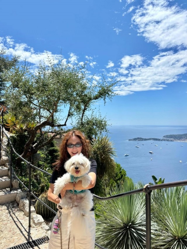 이어 공개된 사진에서는 웅장한 건물을 배경으로 화이트 쇼츠와 블랙 상의를 매치한 김재경이 푸른 바다와 요트를 배경으로 반려견을 품에 안고 환한 미소를 짓고 있다. 이 사진은 경쾌한 휴양지 패션을 강조하며, 김재경의 여유로운 여행을 잘 나타낸다.
