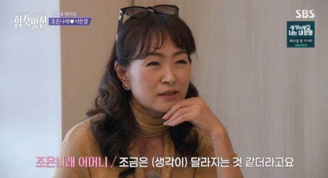 29일 방영된 SBS 예능 '자식방생프로젝트 합숙 맞선'에서 조은나래가 어머니의 저자세에 불만을 표출했다. 이날 방송에서는 조은나래와 서한결이 각자 어머니와 함께 상견례 데이트를 진행했다. 조은나래의 어머니는 서한결을 보자마자 "한결 같은 서한결이 앉아 있었다. 그래서 좋았다"며 긍정적인 반응을 보였다. 이어 "예뻐라. 왜 이렇게 예쁠까. 내가 원하는 그림이네"라고 덧붙였다.