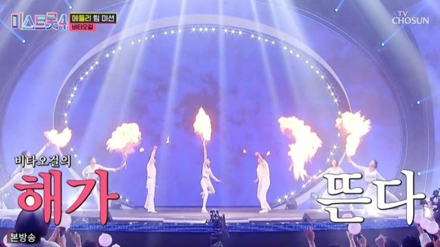 비타오걸 팀은 이어 장윤정의 '이따, 이따요'와 서울패밀리의 '이제는'을 통해 각기 다른 매력을 선보였다. 특히 원하연, 김산하, 남승민은 절도 있는 움직임으로 눈길을 끌었고, 엔딩 포즈 또한 인상적이었다. 무대 중 춘길이 등장하여 불 쇼를 선보였고, 이로 인해 시청자들의 시선을 사로잡았다.