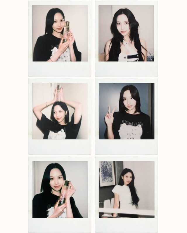 공개된 사진 속 미나는 흰색 티셔츠에 검은색 상의를 매치한 차분한 스타일로 단색 배경 앞에서 제품을 들고 정면을 응시하고 있다. 또 다른 사진에서는 인스탁스 카메라를 들고 자연스러운 일상을 담아내 팬들과 소통하는 모습을 보여줬다.