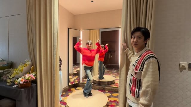 수호는 호텔 로비에서 빨간색 스웨터와 청바지를 착용한 채 거울 앞에서 자유롭게 춤을 추는 모습을 선보였다. 고급스러운 커튼과 다양한 크기의 거울들이 배경에 어우러져 독특한 분위기를 자아냈다. 이에 더해 흰색 니트에 체크무늬 조끼를 매치한 또 다른 사진에서는 한 손으로 커튼을 잡고 서 있는 자연스러운 포즈를 보여 팬들의 관심을 모았다.