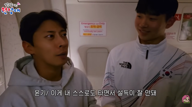 비행기에 탑승한 곽윤기는 프리스타일 모글 스키 국가대표 이윤승(20)을 만났다. 곽윤기는 승무원의 허락을 받아 이코노미석에 탄 이윤승 선수와 자리를 교체했다. 그는 "경기 뛰러 갈 때 한 번도 비즈니스 타본 적이 없는데 해설하고 방송할 때만 비즈니스를 타고 간다. 내 스스로 타면서도 설득이 잘 안된다. 선수 때 못 해본 경험을 왜 지금에서야 하는 거지 싶다"고 자리를 바꾸는 이유를 설명했다.