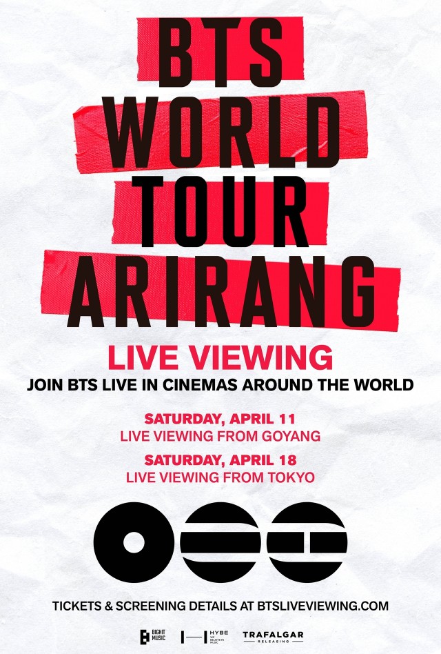 방탄소년단의 새로운 월드투어가 스크린을 통해 팬들과 만난다. 하이브 뮤직그룹 레이블 빅히트 뮤직에 따르면, 4월 11일 고양과 4월 18일 도쿄에서 열리는 'BTS 월드 투어 '아리랑' 공연을 라이브 뷰잉으로 감상할 수 있다. 라이브 뷰잉은 관객들이 한 장소에 모여 콘서트나 스포츠 경기 등을 함께 관람하는 중계 서비스이다.