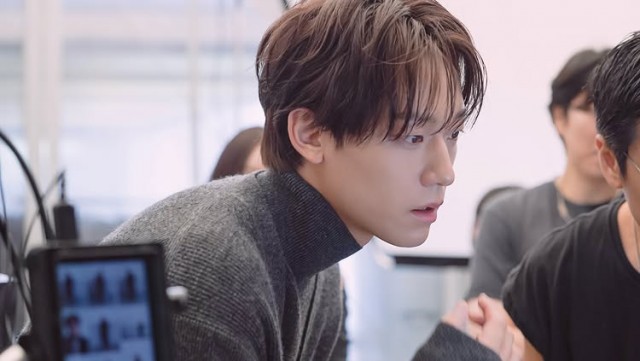 계단에 팔을 걸치고 카메라를 응시하는 장면에서는 회색 재킷과 흰색 셔츠를 입어 도시적인 세련미를 드러냈다. 모니터가 포함된 배경에서는 회색 터틀넥 스웨터를 착용해 편안하면서도 고급스러운 분위기를 연출했다.