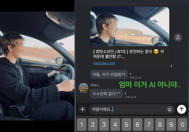 RM은 자신의 운전 실력을 믿지 못하는 모친의 반응도 실시간으로 공개했다. RM의 모친은 유튜브에 올라온 아들의 운전 영상을 공유하며 "이거 리얼임? 진짜 같다"고 말했다. RM은 "엄마 이거 AI 아니다. 리얼"이라고 해명하며 웃음을 자아냈다.
