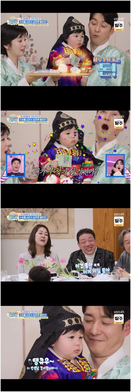 돌잔치의 하이라이트는 한국 전통의 돌잡이였다. 심형탁의 아내 사야는 아들이 잡기를 바라는 물건 중 하나로 자신의 사원증을 선택했다. 사야는 "제가 원래 회사원이었다. 그래서 하루도 경험하면 좋겠다"고 설명했다. 심형탁은 아들이 마이크를 잡기를 바랐고, 손민수가 "본인과 같은 연예인으로 키우고 싶냐"고 묻자 심형탁은 "맞다"고 답했다. 또한, 사야의 아버지가 만든 면도 후보군에 올라갔다.