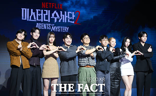 [더팩트ㅣ서예원 기자] 댄서 가비와 배우 혜리, 그룹 에스파의 카리나, 가수 존박, 배우 김도훈, 방송인 이용진(왼쪽 위부터 시계방향으로)이 19일 오전 서울 마포구 호텔 나루 서울 엠갤러리에서 열린 넷플릭스 오리지널 예능 ‘미스터리 수사단’ 시즌2 제작발표회에 참석해 포즈를 취하고 있다.