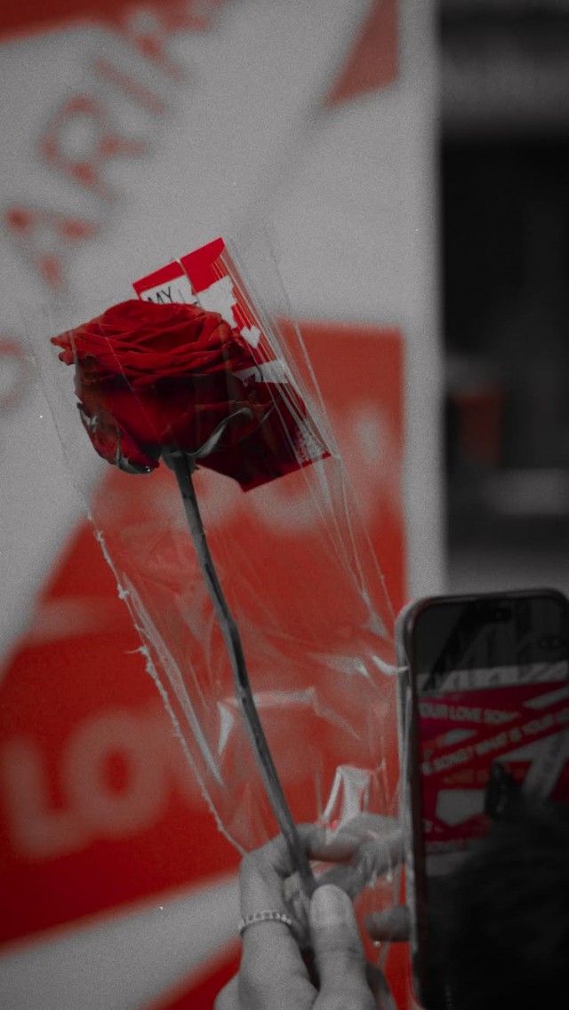 BTS 공식 SNS 계정에는 최근 "Keep the love songs playing till we meet again.(다시 만날 때까지 사랑 노래가 계속 울려 퍼지길)"라는 글과 함께 장미꽃을 한 손에 든 사진이 올라왔다. 배경에는 흰색과 빨간색이 어우러진 간판이 자리해 소박하면서도 의미 있는 분위기를 자아냈다. 스마트폰을 손에 쥔 채 장미꽃을 들고 있는 모습을 통해 팬들에게 전하는 애틋한 마음이 느껴진다.