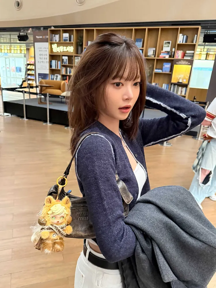 최근 공개된 사진 속에서 홍은채는 회색 가디건과 흰색 바지를 매치해 심플하면서도 톤 다운된 조합을 선보였다. 특히 에스컬레이터에 올라 책이 가득한 서가를 배경으로 정면을 바라보는 모습에서 차분한 분위기가 느껴졌다. 어깨에 멘 가방에는 귀여운 장식 인형이 달려 있어 작은 디테일까지 돋보였다.