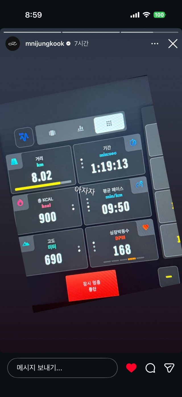 방탄소년단(BTS) 정국은 최근 운동에 대한 열정으로 팬들의 큰 주목을 받았다. 그는 1월 20일 새벽 자신의 인스타그램 스토리를 통해 운동 중인 모습을 공개했다. 정국은 러닝머신에서 1시간 19분 동안 8km 이상을 뛰며 900kcal를 소모한 기록을 인증하는 사진을 게시했다. 그는 "아자자"라는 문구를 덧붙이며 운동에 대한 의지를 드러냈다.