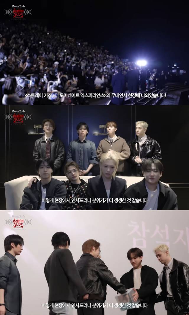 방찬은 "저희의 첫 영화인 '도미네이트 익스피리언스' 무대인사 현장에 나와 있다"며 소감을 전했고, 멤버들은 "현장에서 인사드리니 분위기가 더 생생한 것 같다"며 들뜬 마음을 표현했다. 또한, 멤버들은 스크린X 등 다양한 포맷으로 상영되는 자신들의 공연 실황 영화에 대해 "이렇게 큰 스크린으로 저희를 볼 수 있다는 게 정말 영광이다"라며 벅찬 감동을 전했다.