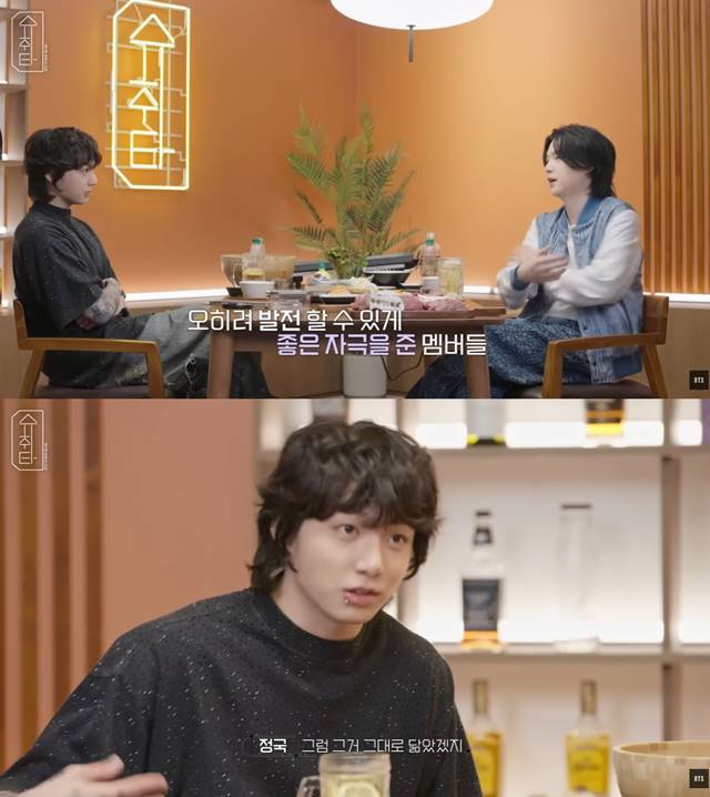 정국은 "내 말투나 단어 선택 등에 멤버들의 모습이 스며들어 있다"며, 의도하지 않아도 형들의 장점을 스펀지처럼 흡수하며 살아온 시간들을 회상했다. 그는 "스스로를 유연한 사람이라고 생각한다"며, 다른 사람들과 대화할 때 문득 형들이 강조했던 포인트들이 생각나 조언에 활용하기도 한다는 에피소드를 전해 슈가를 흐뭇하게 했다.