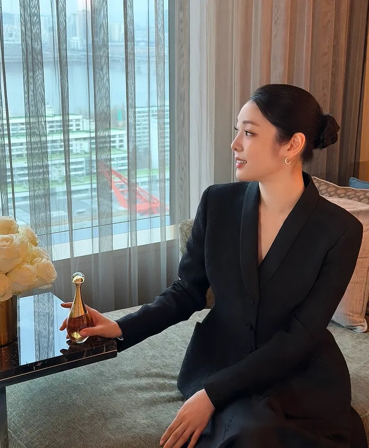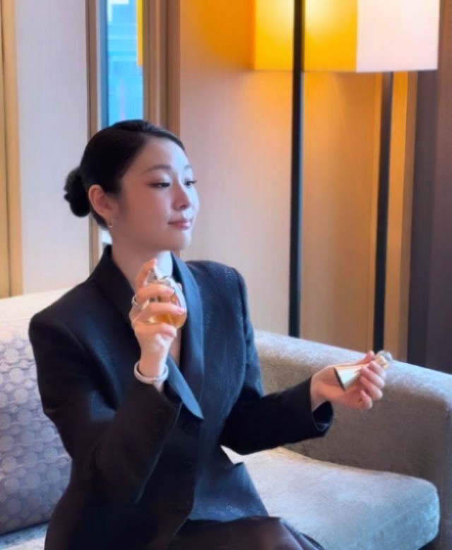 최근 김연아는 검은색 정장을 입고 현대적인 실내 공간에서 다양한 포즈를 취한 모습을 선보였다. 부드러운 조명이 은은하게 비추는 공간에서 향수를 손에 든 채 정면과 옆을 바라보며 우아한 분위기를 자아냈다. 특히 향수를 뿌리려는 동작과 테이블에 앉아 향수를 바라보는 모습에서는 세련된 이미지가 돋보였다.